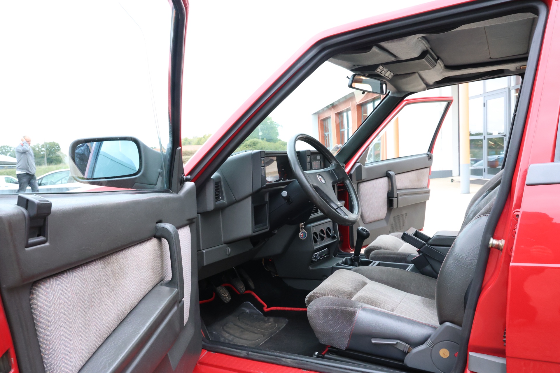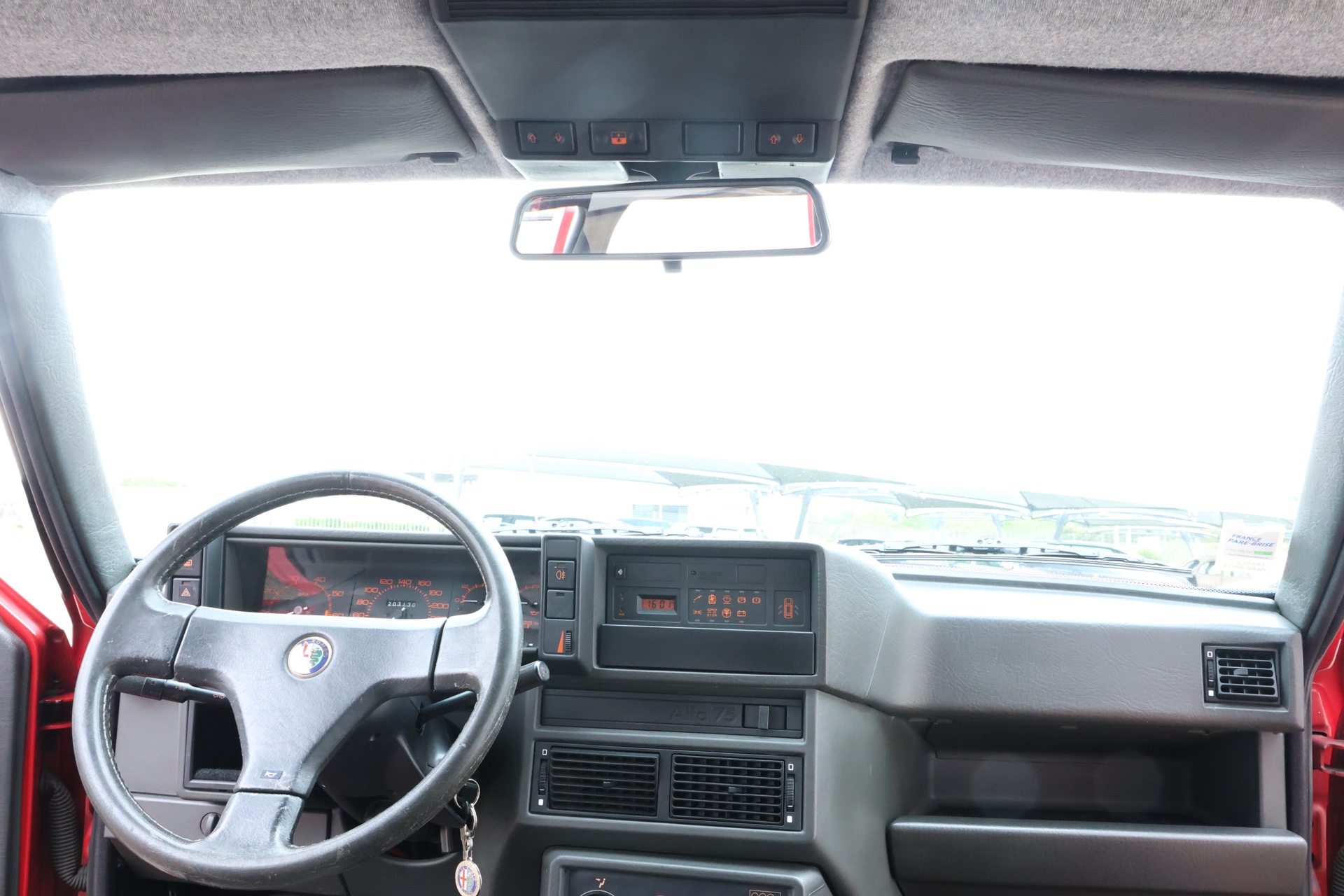 Notre exemplaire Alfa RoM2O 75 ie Turbo version America a été achetée neuve en 1990 et conservée jusqu’à aujourd’hui par le même propriétaire qui l’a entretenue régulièrement; de couleur Rosso, une sellerie tissu velours chiné gris, un tableau de bord atypique avec son instrumentation complète et fonctionnelle; un ciel de toit feutrine gris dans un très bel état; une carrosserie sportive avec son toit ouvrant électrique. Ce modèle est l’ultime développement de la plateforme Transaxale (propulsion et boîte de vitesses à l’arrière).