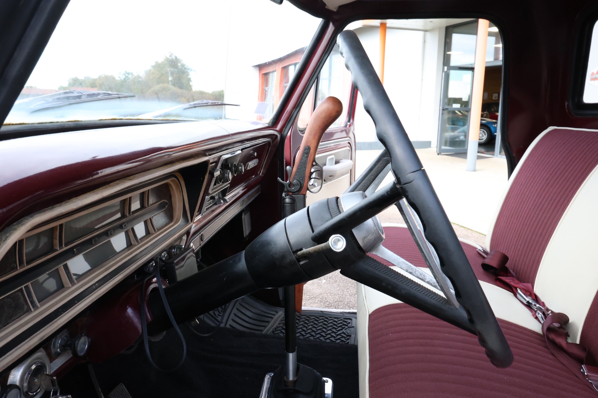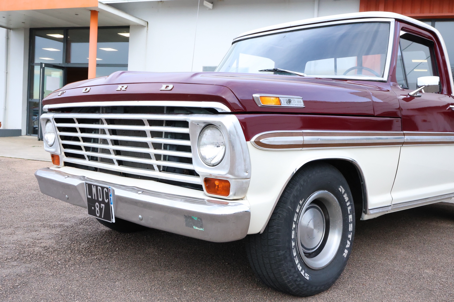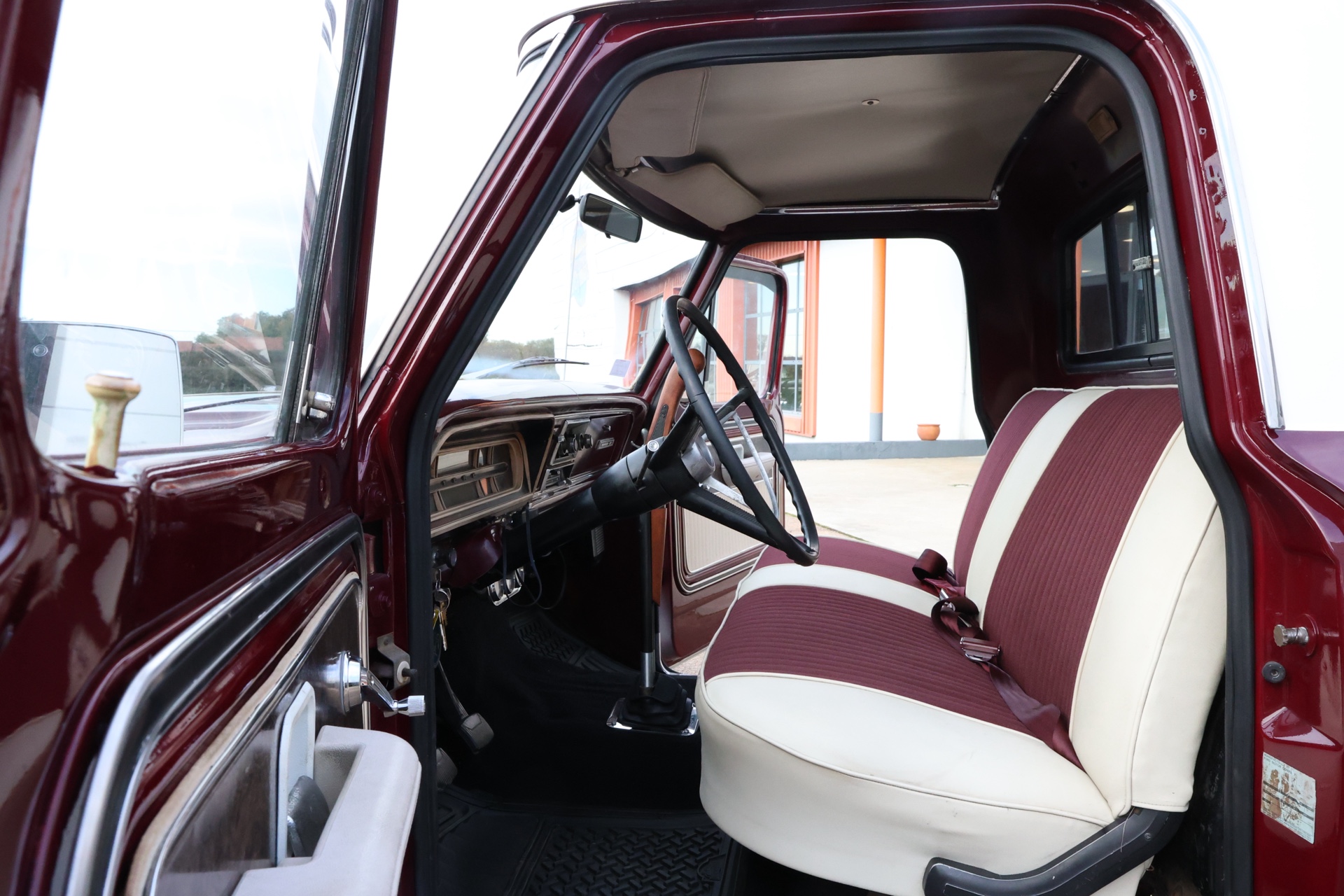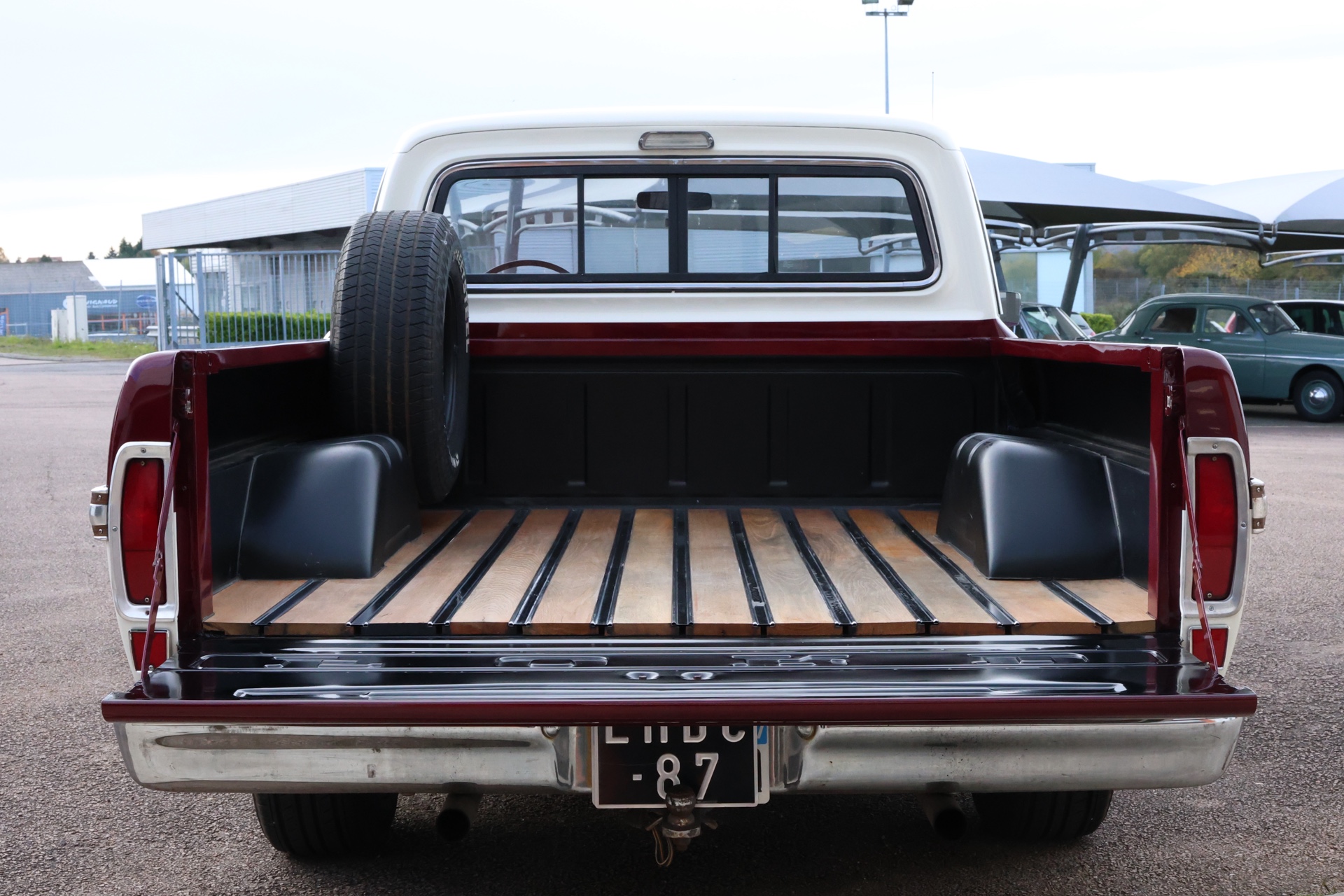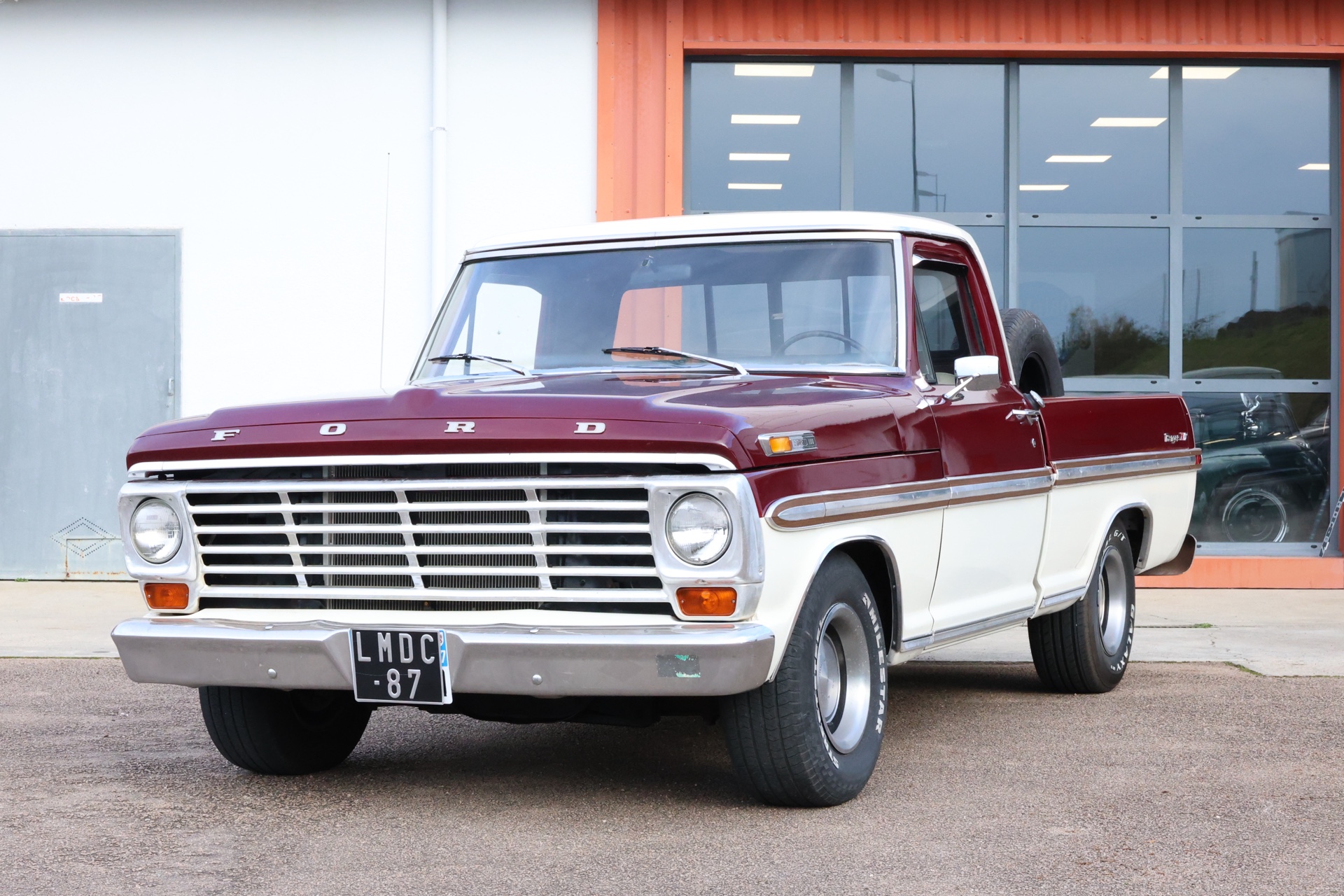 Je vous propose une légende née sur les routes d’Amérique, le Ford F100 pick-up ; des lignes anguleuses typiques des années 60-70 ; un habitacle très spacieux ; une carrosserie bicolore crème/bordeaux que l’on retrouve à l’intérieur, sur la banquette et panneaux de portes ; tout cela en parfaite harmonie