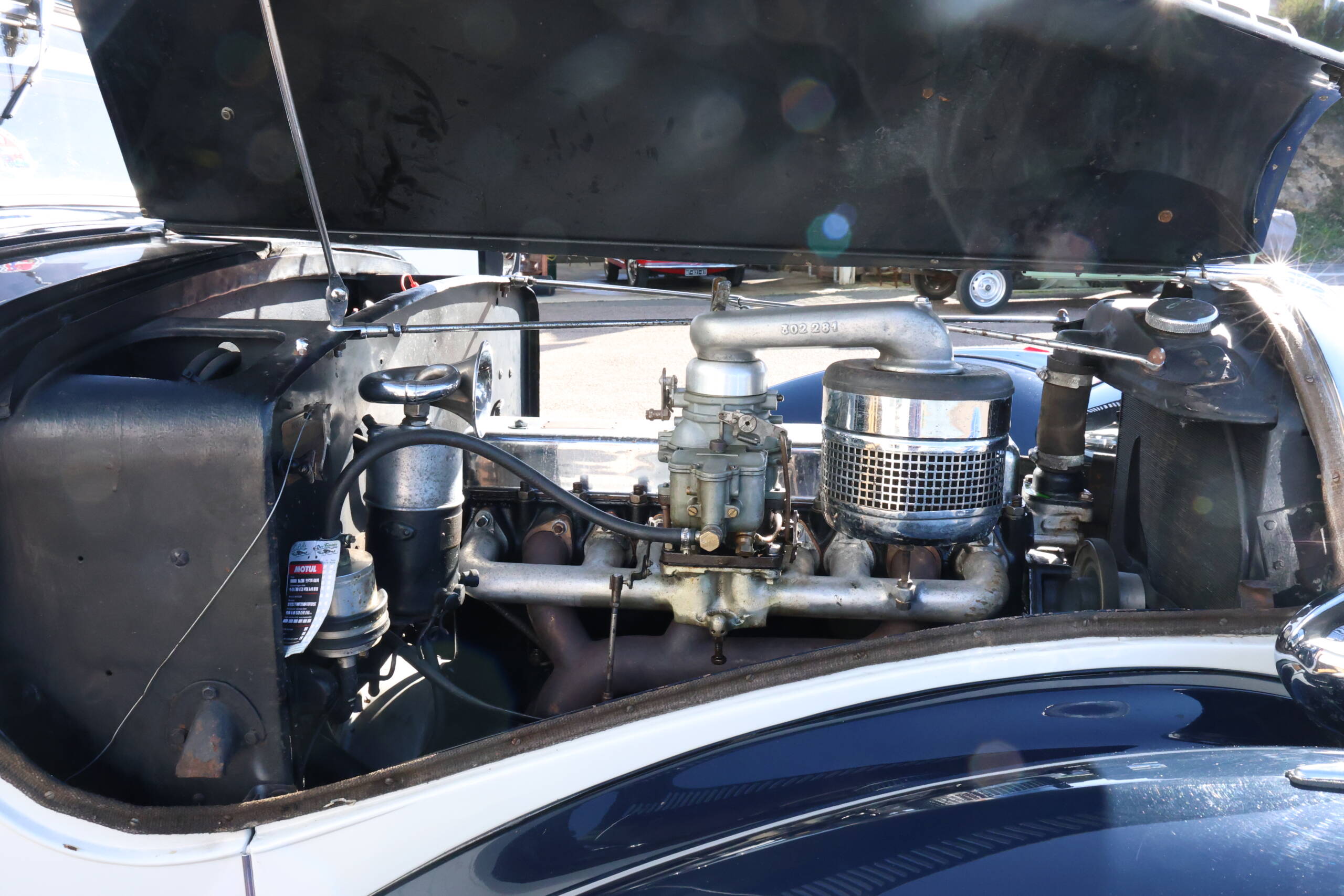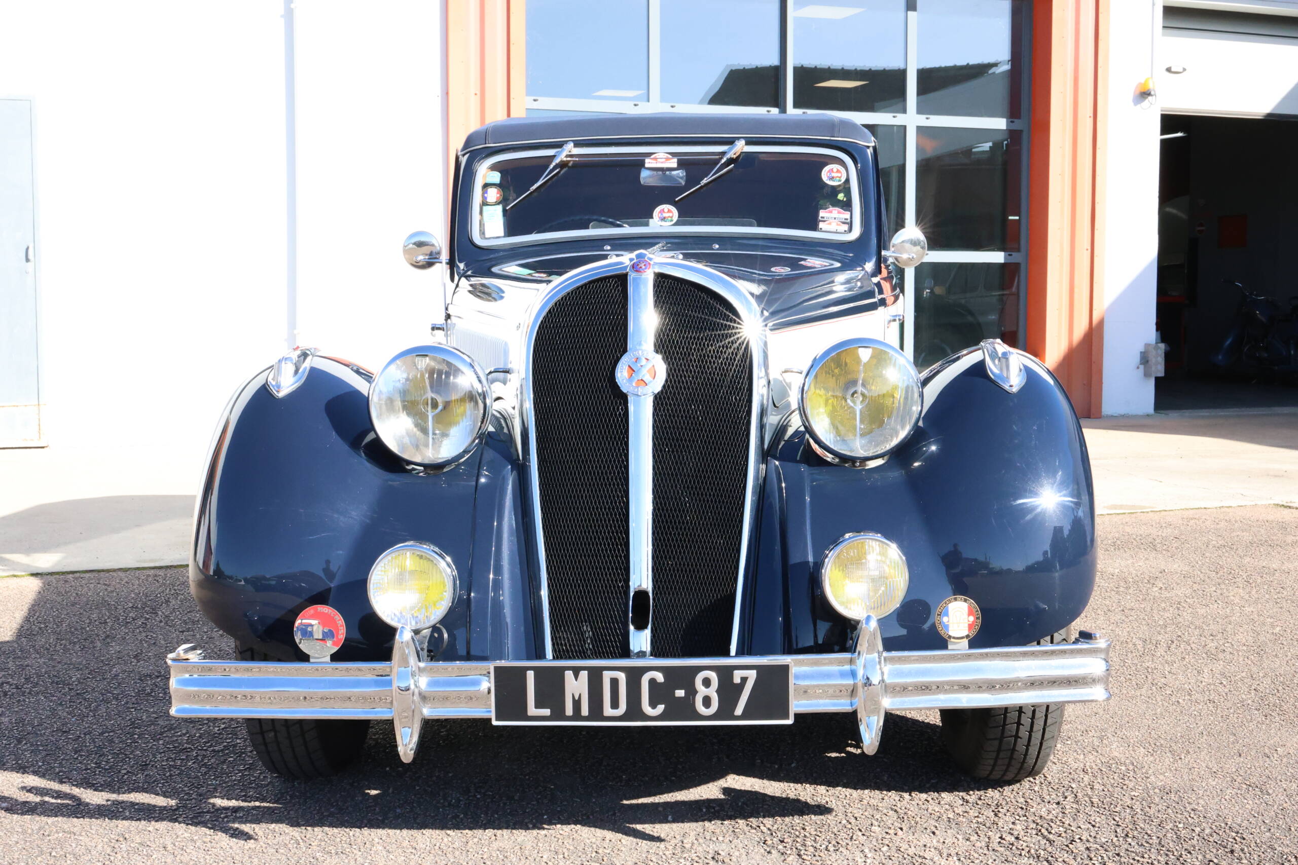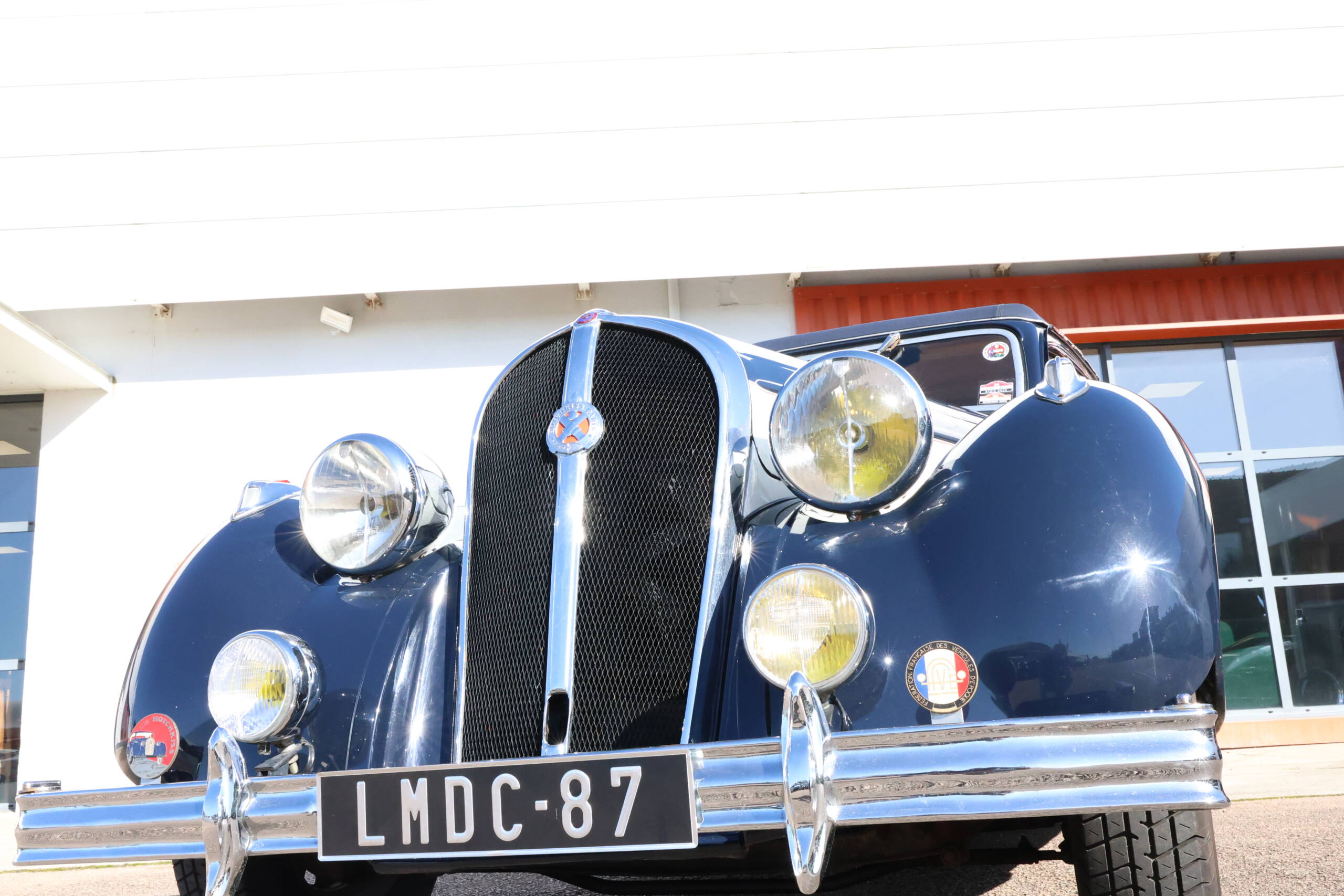 Notre exemplaire, rare Hotchkiss Type 686PN Monte-Carlo, une coach découvrable au caractère bien affirmé, ton bicolore bleu et crème, une des neufs restantes sur les 20 exemplaires produits, affiche 17 875 km relevé compteur. Ce modèle type 686PN (Paris Nice) est à la fois élégant et sportif; en effet, la lignée 686 fut très active en rallyes (Monte-Carlo); Hotchkiss, l’une des seules marques a avoir remporté 6 fois l’épreuve.