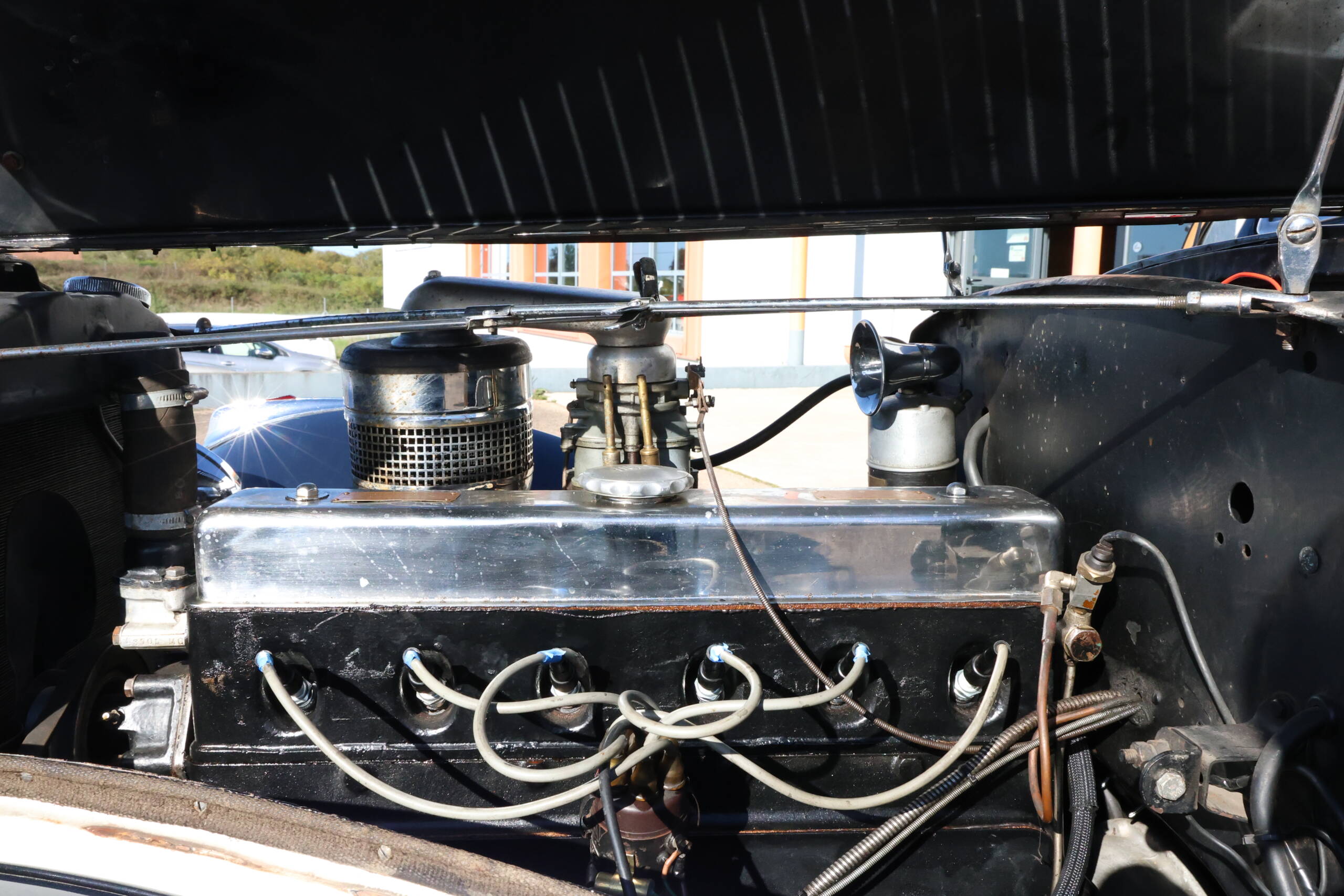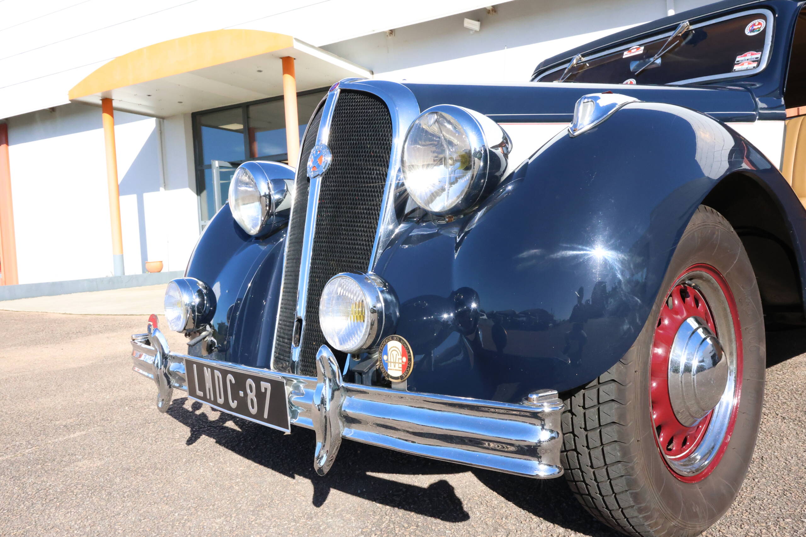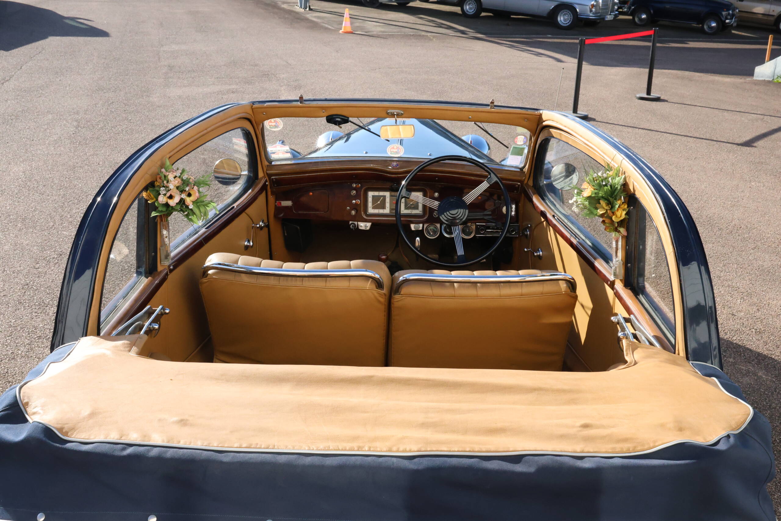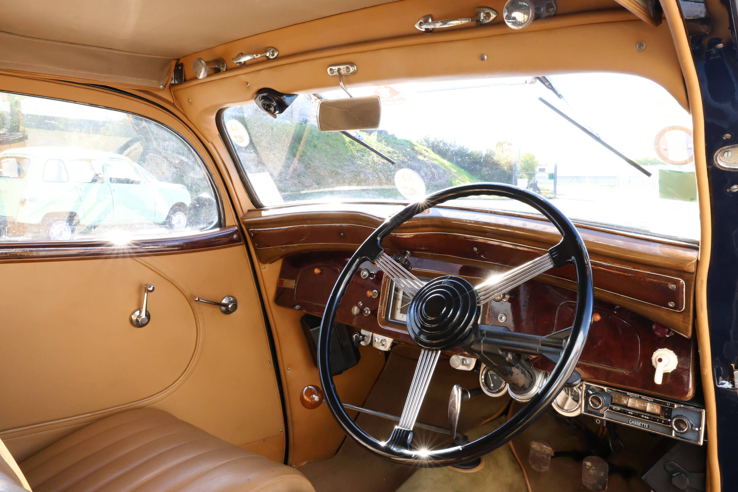 Notre exemplaire, rare Hotchkiss Type 686PN Monte-Carlo, une coach découvrable au caractère bien affirmé, ton bicolore bleu et crème, une des neufs restantes sur les 20 exemplaires produits, affiche 17 875 km relevé compteur. Ce modèle type 686PN (Paris Nice) est à la fois élégant et sportif; en effet, la lignée 686 fut très active en rallyes (Monte-Carlo); Hotchkiss, l’une des seules marques a avoir remporté 6 fois l’épreuve.