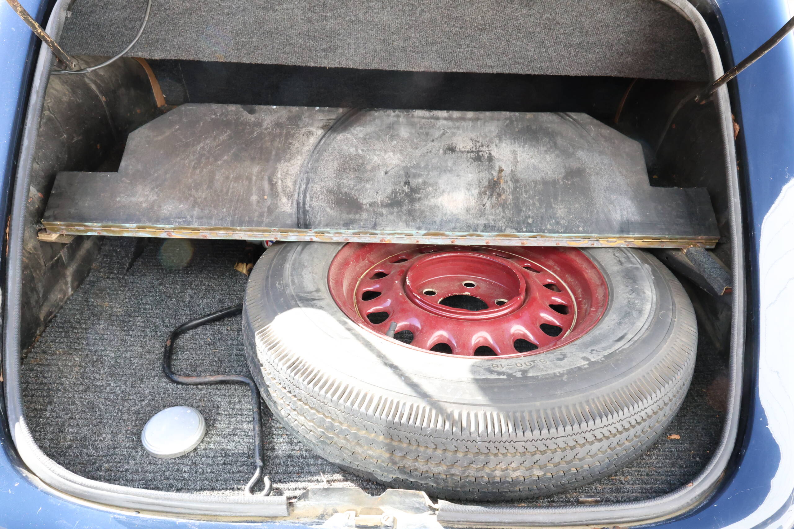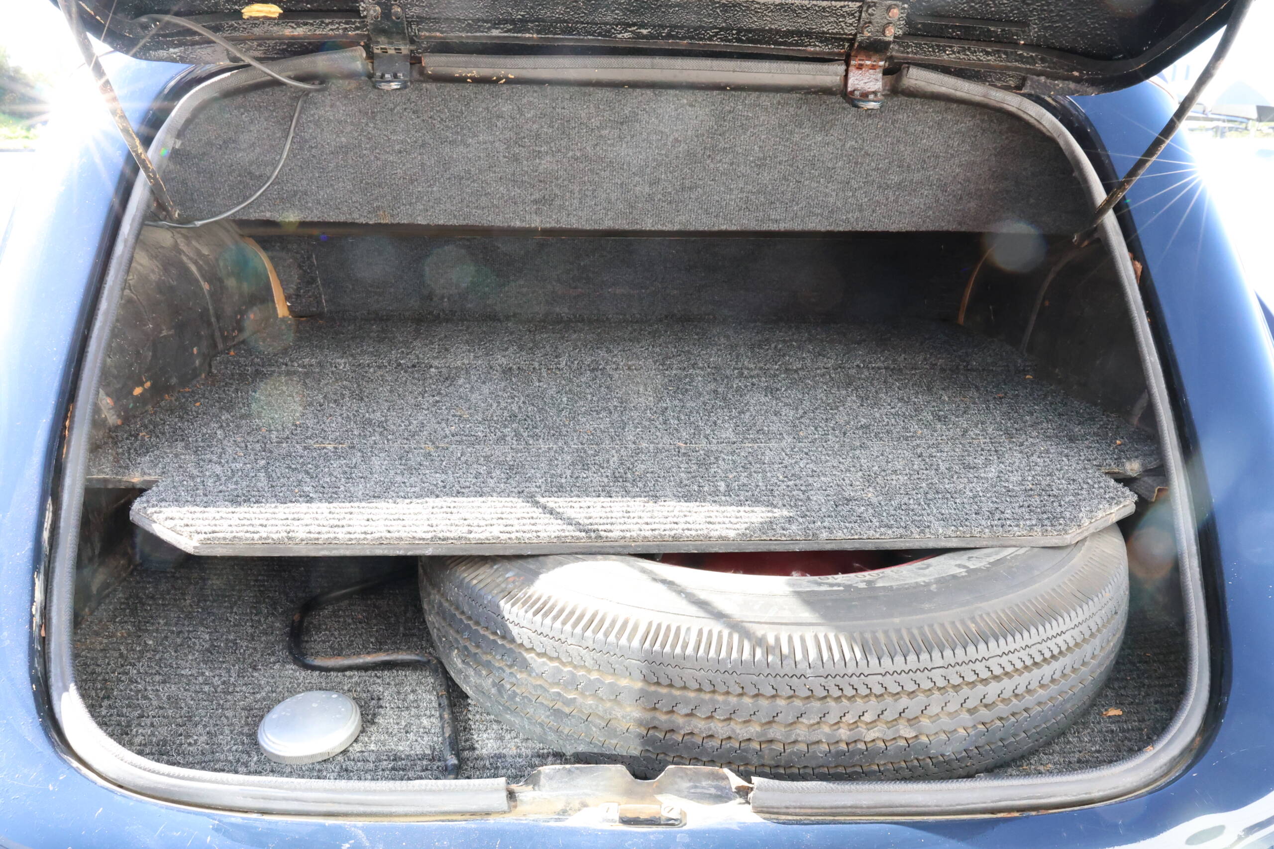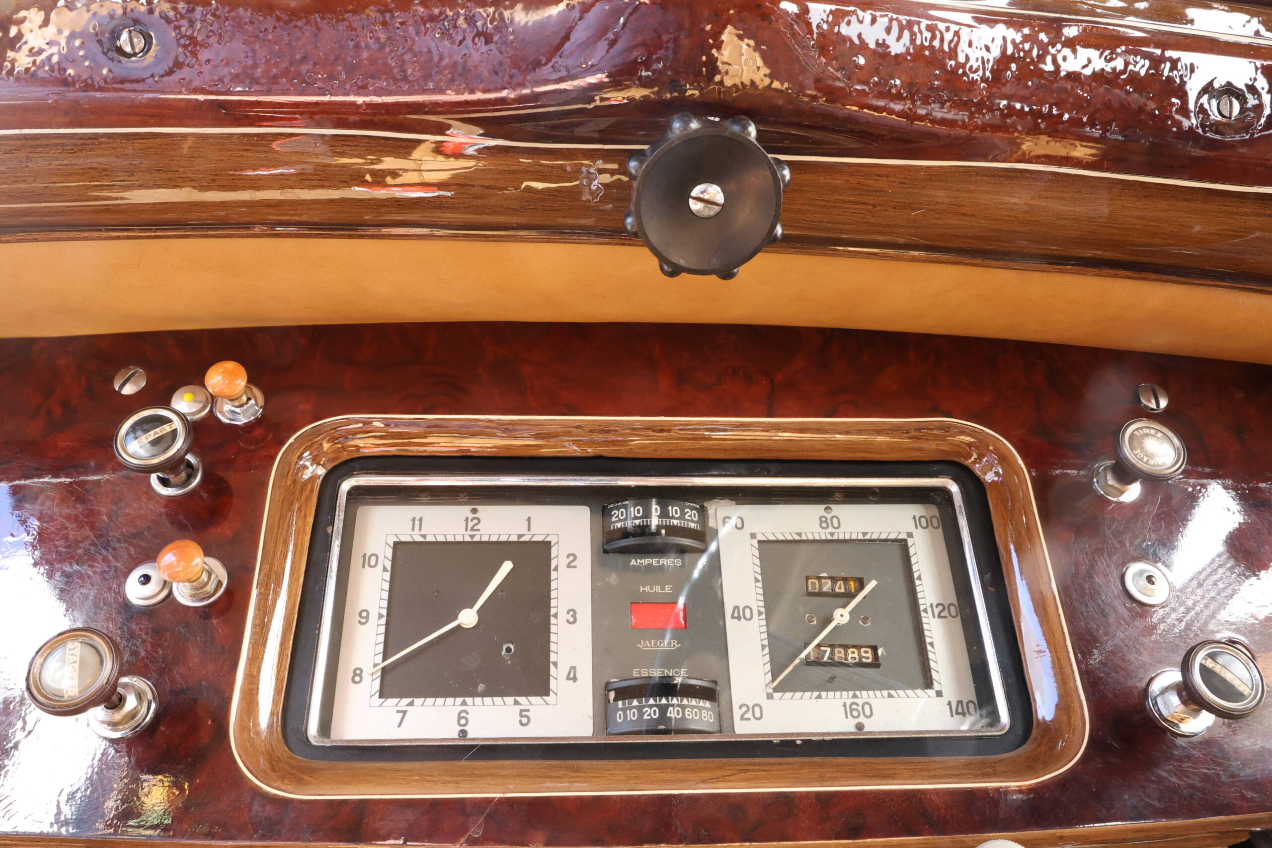 Un habitacle aux détails d’une grande finesse, sellerie tout cuir beige clair, y compris les panneaux de porte, une légère patine mais sans usure notable; très bien conservée au vu de son âge; une planche de bord avec son instrumentation Jaeger fonctionnelle; une capote Alpaga bleu marine en parfaite harmonie avec sa carrosserie et en très bon état.